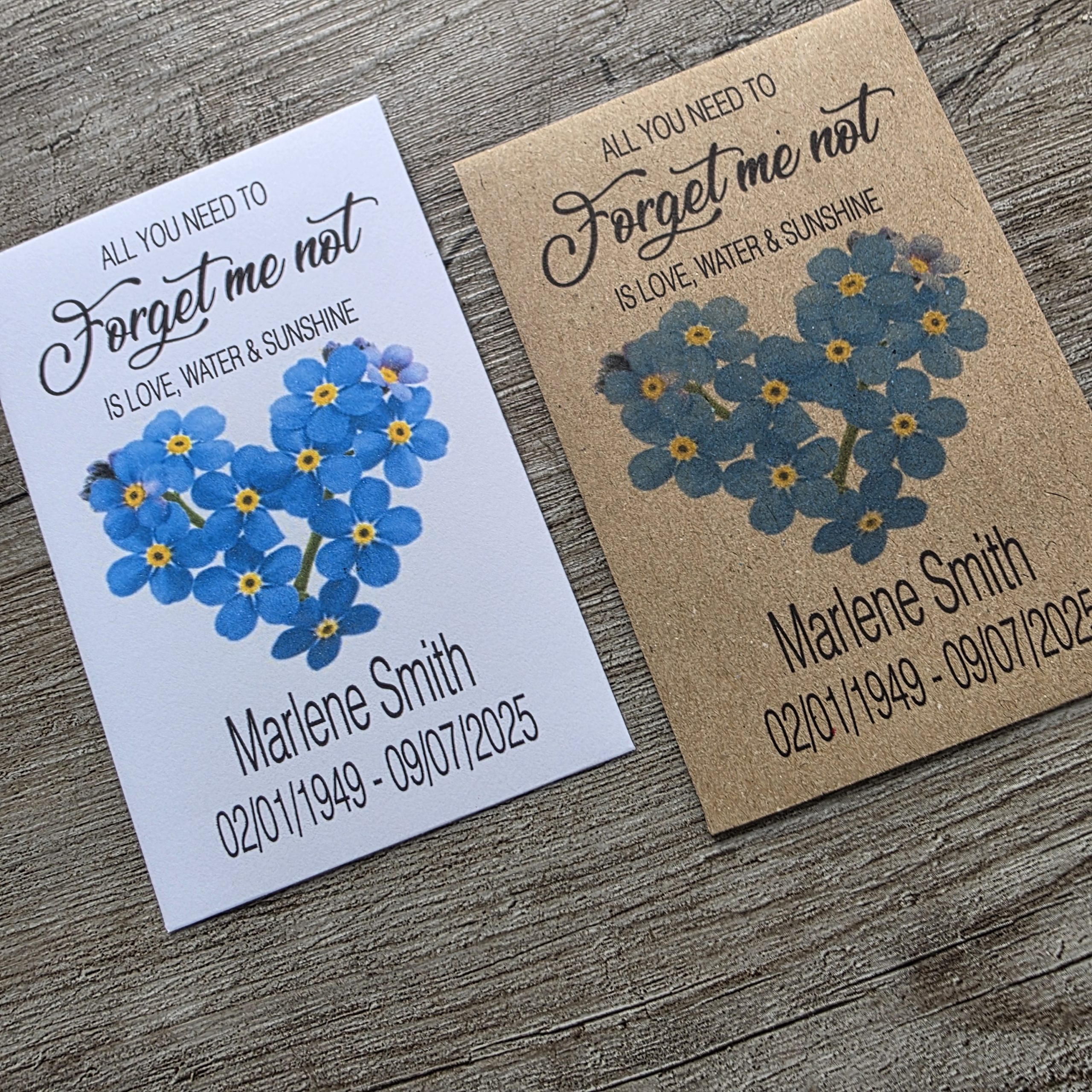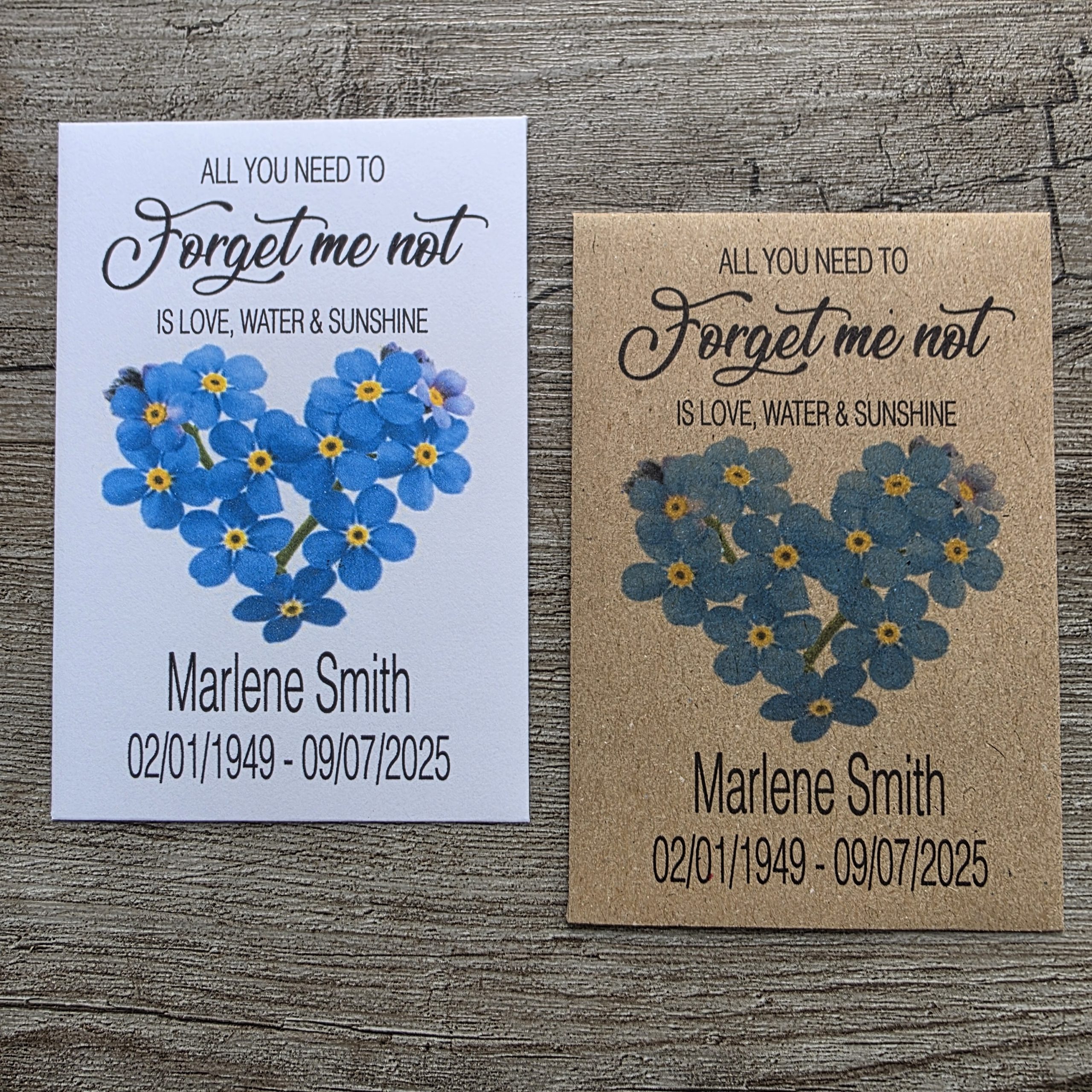 Set of 10 personalised Forget-Me-Not seed packets — a heartfelt funeral favour or celebration of life keepsake. Each packet contains 0.3g of seeds and measures 67 x 98 mm. Printed with your loved one’s name and dates.
